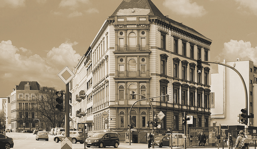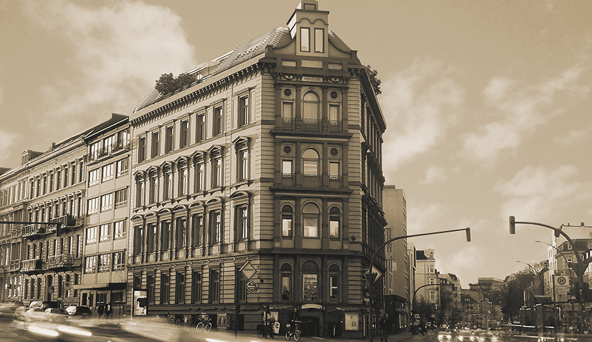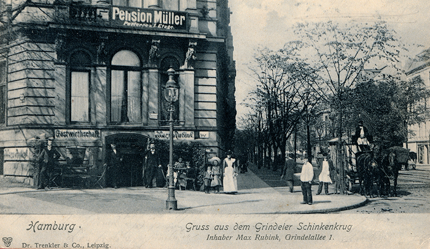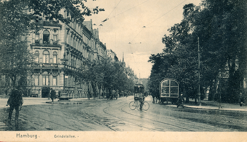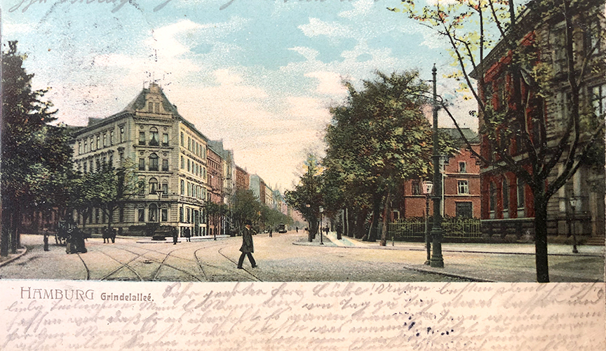 Lage: Die Adresse Grindelallee 1 ist mitten im Grindelviertel gelegen. Hier entwickelte sich mit dem Anwachsen Hamburgs im 19. Jahrhundert das Zentrum der dortigen jüdischen Gemeinden. Ausdruck hierfür war unter anderem der Bau mehrerer neuer Synagogen. Zum Zeitpunkt der Machtübergabe an die Nationalsozialisten, lebten ca. 25.000 Angehörige jüdischer Gemeinden im Grindelviertel. In der Grindelallee 1 wohnte derzeit der deutsche Journalist, Schriftsteller, Pazifist und Friedensnobelpreisträger Carl von Ossietzky.